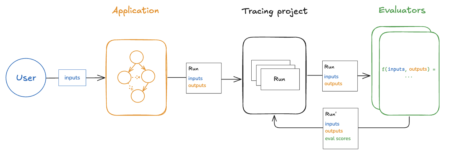 Evaluating a deployed application's outputs in (roughly) realtime is what we call "online" evaluation. In this case there is no dataset involved and no possibility of reference outputs — we're running evaluators on real inputs and real outputs as they're produced. This is be useful for monitoring your application and flagging unintended behavior. Online evaluation can also work hand-in-hand with offline evaluation: for example, an online evaluator can be used to classify input questions into a set of categories that can be later used to curate a dataset for offline evaluation.