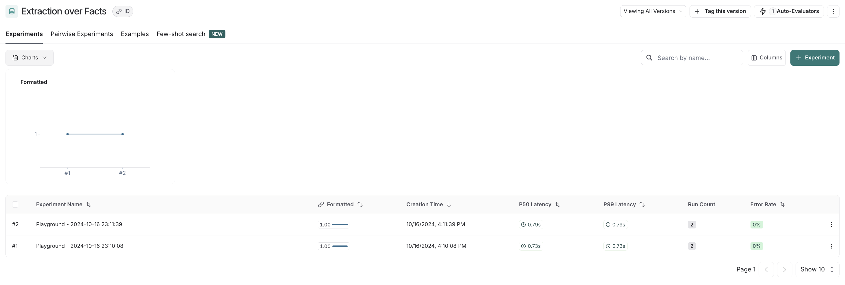 On the dataset, if you now click to the experiments tab -> + Experiment -> Run in Playground, you can see the results in action. Your runs in your experiments will be automatically marked with the key specified in your code sample above (here, formatted):